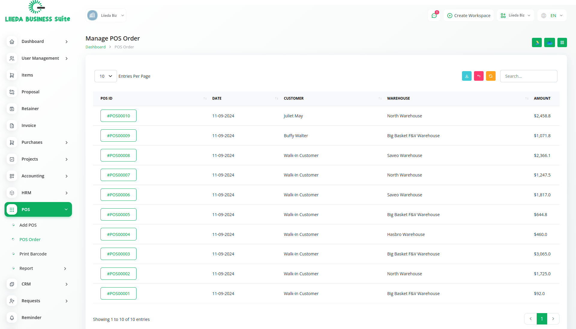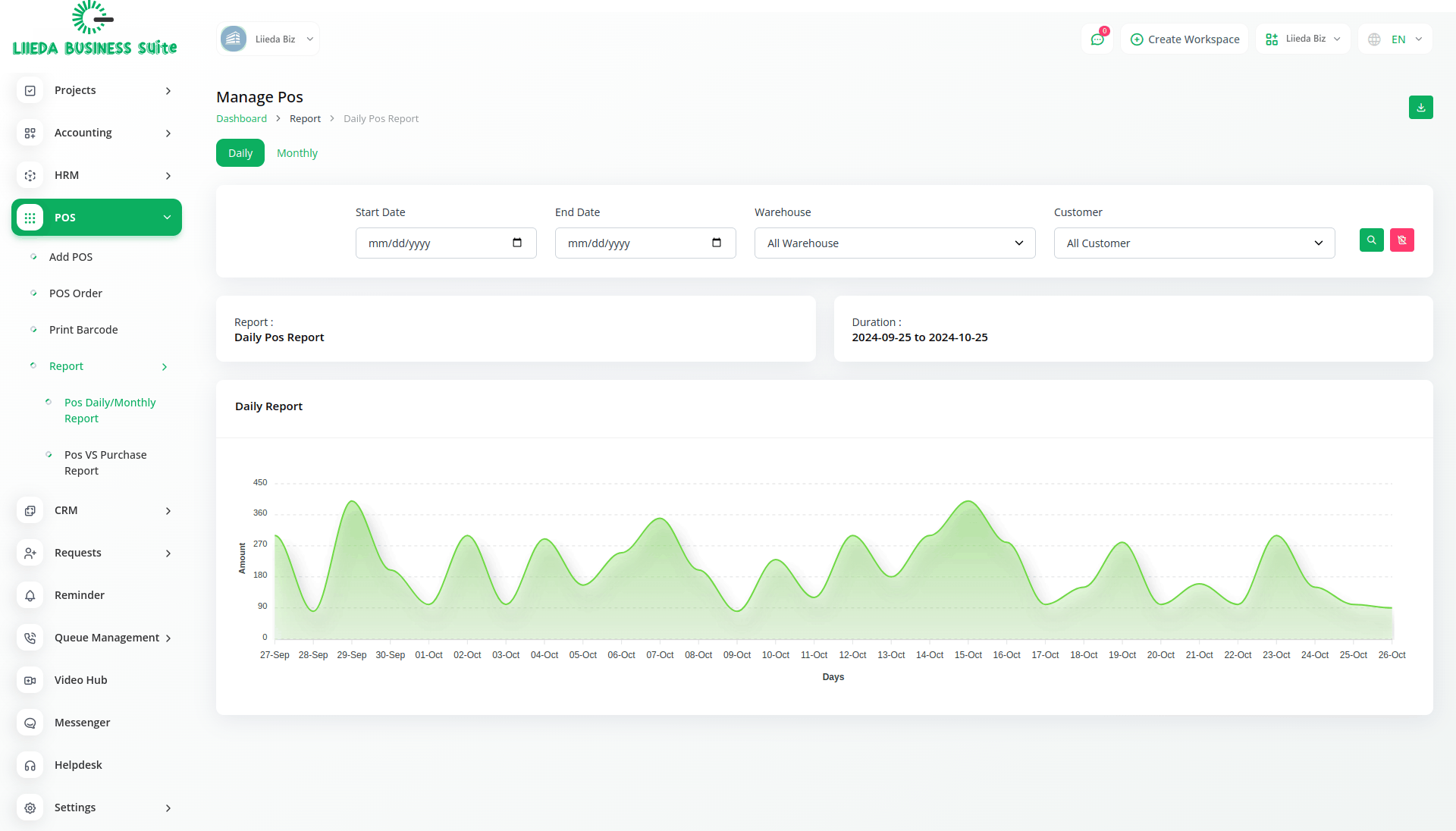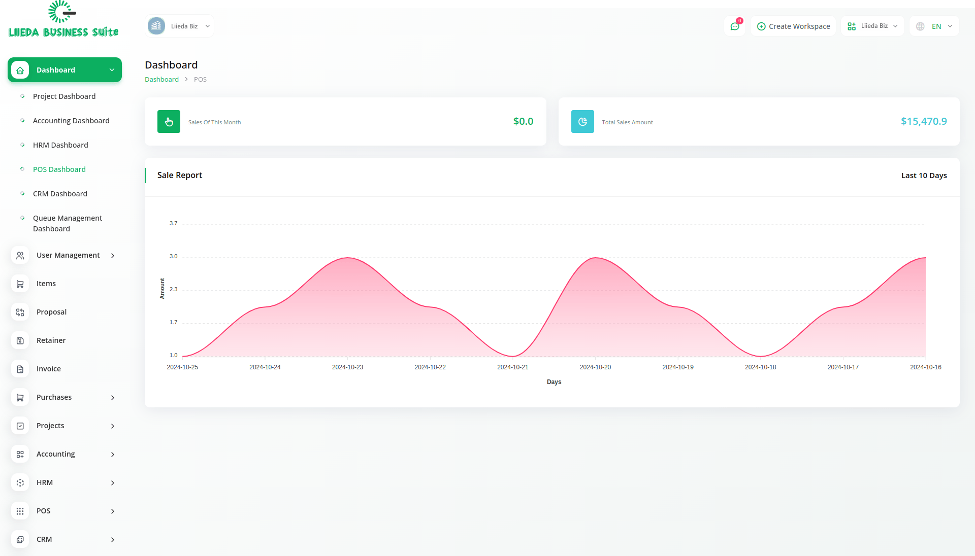 Welcome to the POS Module in Liieda Business Suite, your ultimate solution for streamlined sales management. Our platform offers a user-friendly dashboard where you can easily navigate through your sales activities. At the heart of the dashboard is a dynamic chart representing your sales reports, providing valuable insights into your business is performance. Whether you are a small retail store or a bustling restaurant, our POS Module empowers you to efficiently manage your sales process from start to finish.
