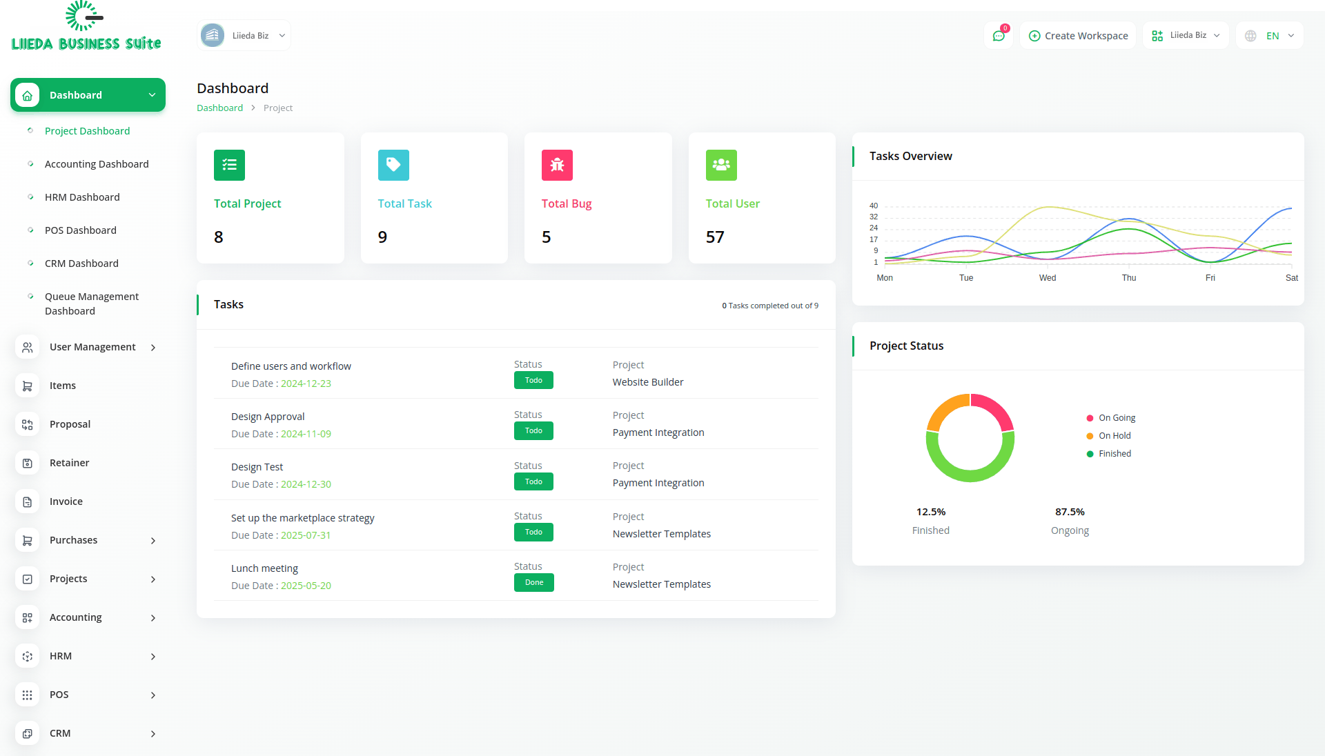 Get an overview of the total number of projects, tasks, bugs, and members. A visual representation of the task overview and project status can help you estimate the progress on each task. Lastly, you can check the top due task.