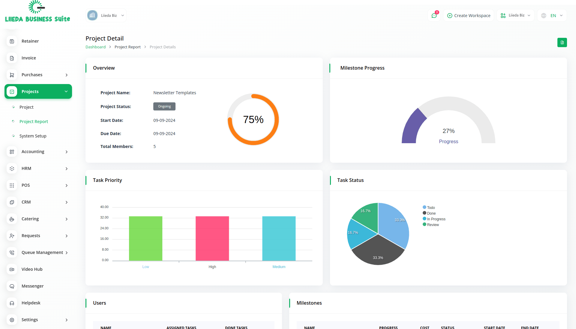 Attach cost and summary to milestones and change the status through the drop-down menu. Get a tab on recent activities of a project and also a graph about progress. Along with that, you can check your tasks’ details under project details with the help of the Gantt Chart.