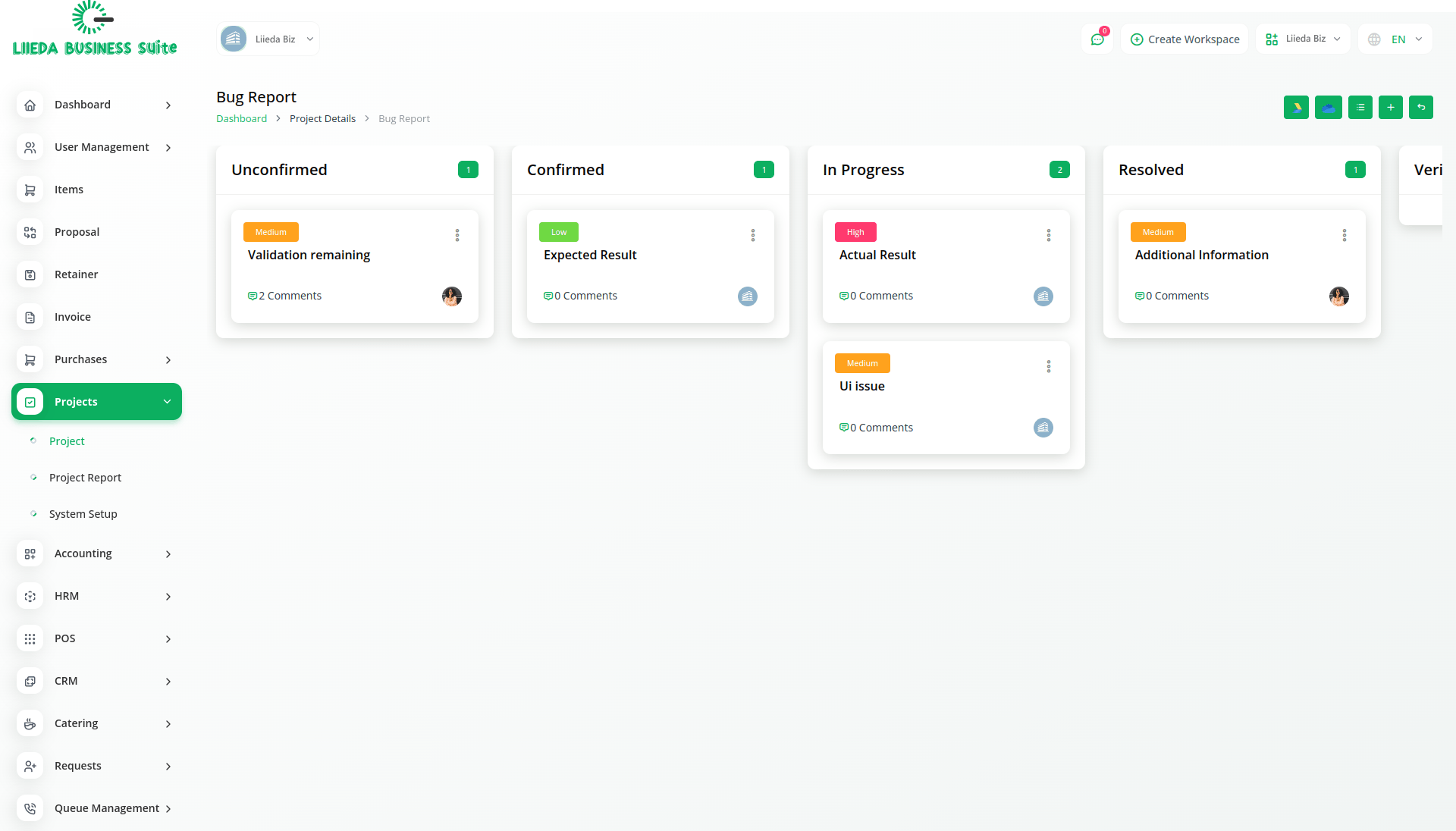 Create new bugs and assign users and priority to them. You can write a note in the text box for the bug description. Also, the status of each bug could be changed through an easy drop-down and Kanban drag system.